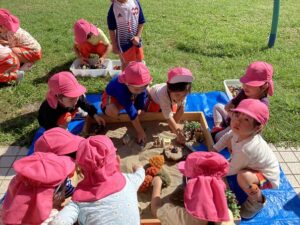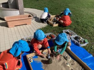 本園には箱庭の用具があり、時折遊びの機会を設けています。この日は年少クラスが計画し、砂がこぼれても良いように2つの箱をテラスに準備していました。折しも素晴らしい秋晴れで、次々に子どもが外に出ていましたが、そのうち先に出た年中さんが箱庭の用意を見て「遊んでもいいですか?」と、フライング気味に箱庭遊びの開始。嬉しい反応です。