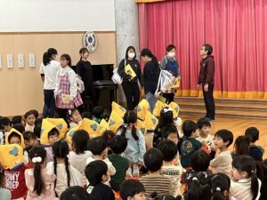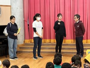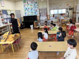 副園長先生から、今日の避難訓練のお話を聞きます。